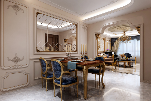 餐桌和餐椅均為金色色,表面略帶雕花,配合扶手和椅腿的弧形曲度,顯得優(yōu)雅矜貴,而在深藍色的卷草紋窗簾、水晶吊燈的搭配下,浪漫清新之感撲面而來。